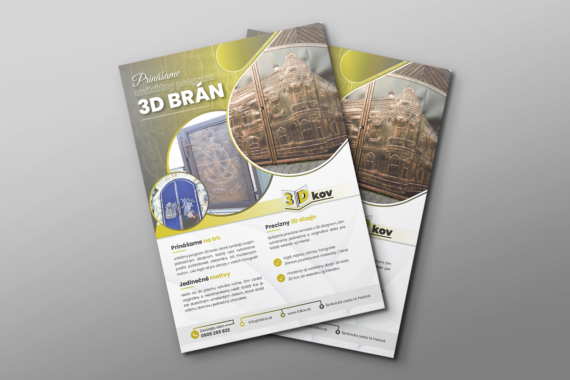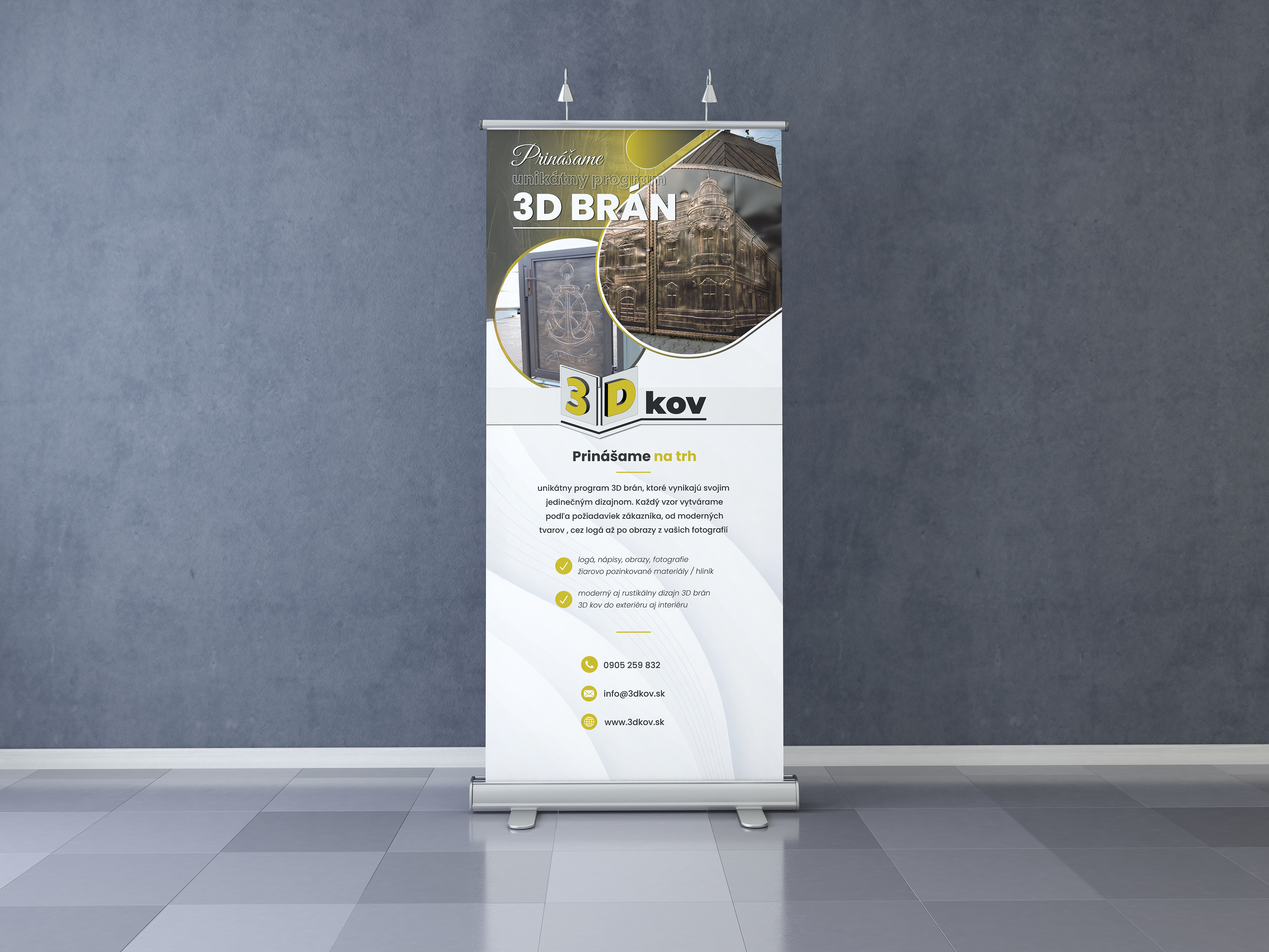 Logo pre kováčstvo, ktoré sa rozhodlo priniesť na trh unikátny program 3D brán. Toto logo je vytvorené presne podľa požiadavky klienta - dve do priestoru otvorené krídla brány s vystúpeným písmom 3 a D. Na výstavu boli pripravené aj letáky a rollup.