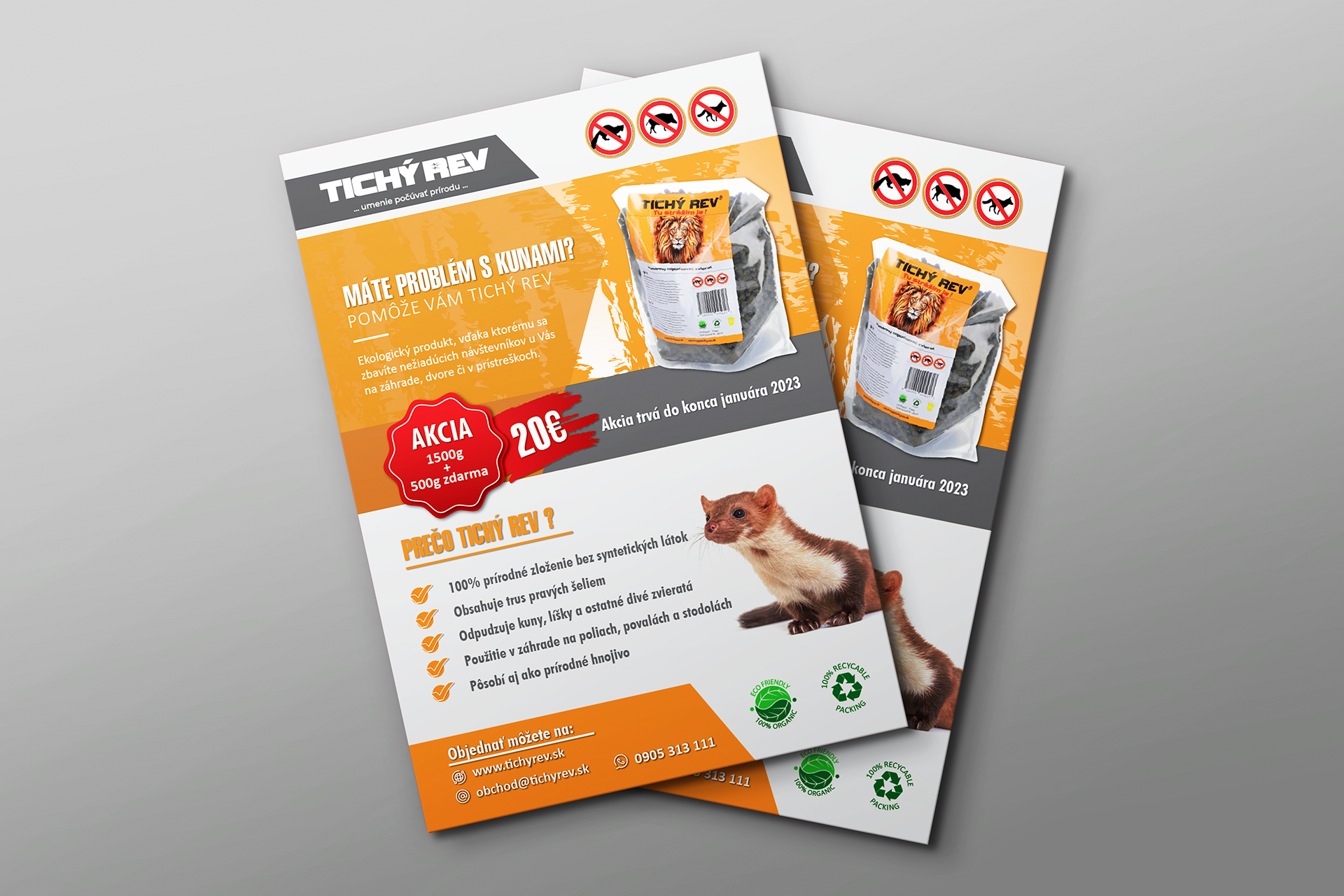Pre zaujímavý produkt na trhu - odpudzovač zvierat ( pelety s trusom pravých šeliem ), vzniklo nové logo, etiketa na balenie a grafika letákov. Pre logo bol použitý výrazný tučný font a v písmene R symbol kriku.